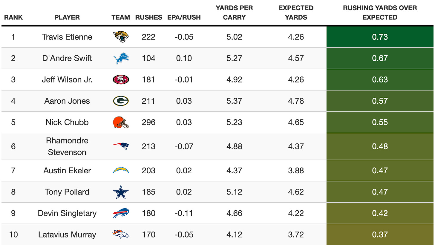 Travis Etienne was arguably the most efficient rusher in the league in 2022. Despite the Jaguars having the 30th-ranked run-blocking unit according to PFF last season, he was among the league's best (min 100 attempts) in RYOE, YCO/A, MTF, breakaway runs, YPC, and total yards created. Additionally, Etienne ranked 20th in WOPP/G with 15.68.